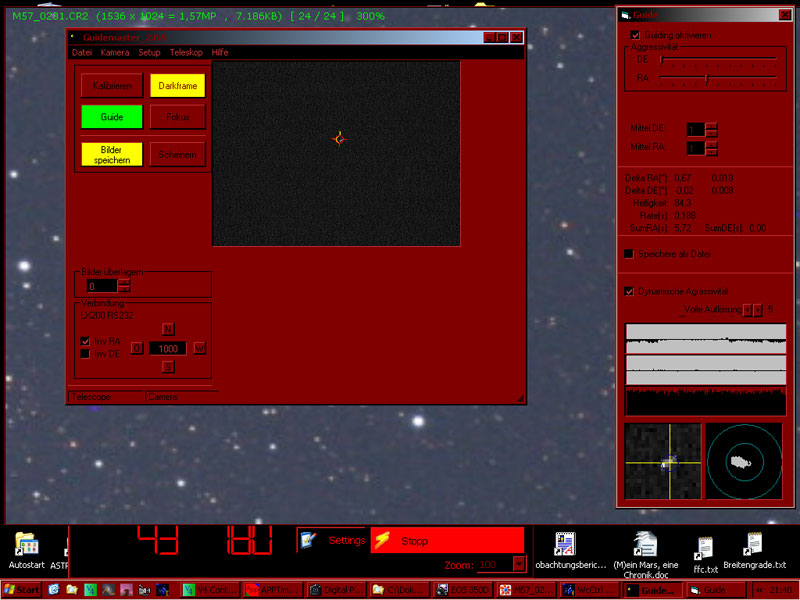Die Software zum Guiden muß ich noch besser Verstehen lernen, aber die Ergebnisse damit stimmen mich zuversichtlich: Ich erreichte bessere Ergebnisse als das letzte Mal, als ich mich noch mit den technischen Problemen auseinander setzen mußte. Interessant ist auch, das die Parameter jedes mal neu abgestimmt werden müssen, da (fast) jede Nacht andere atmosphärische Bedingungen hat.