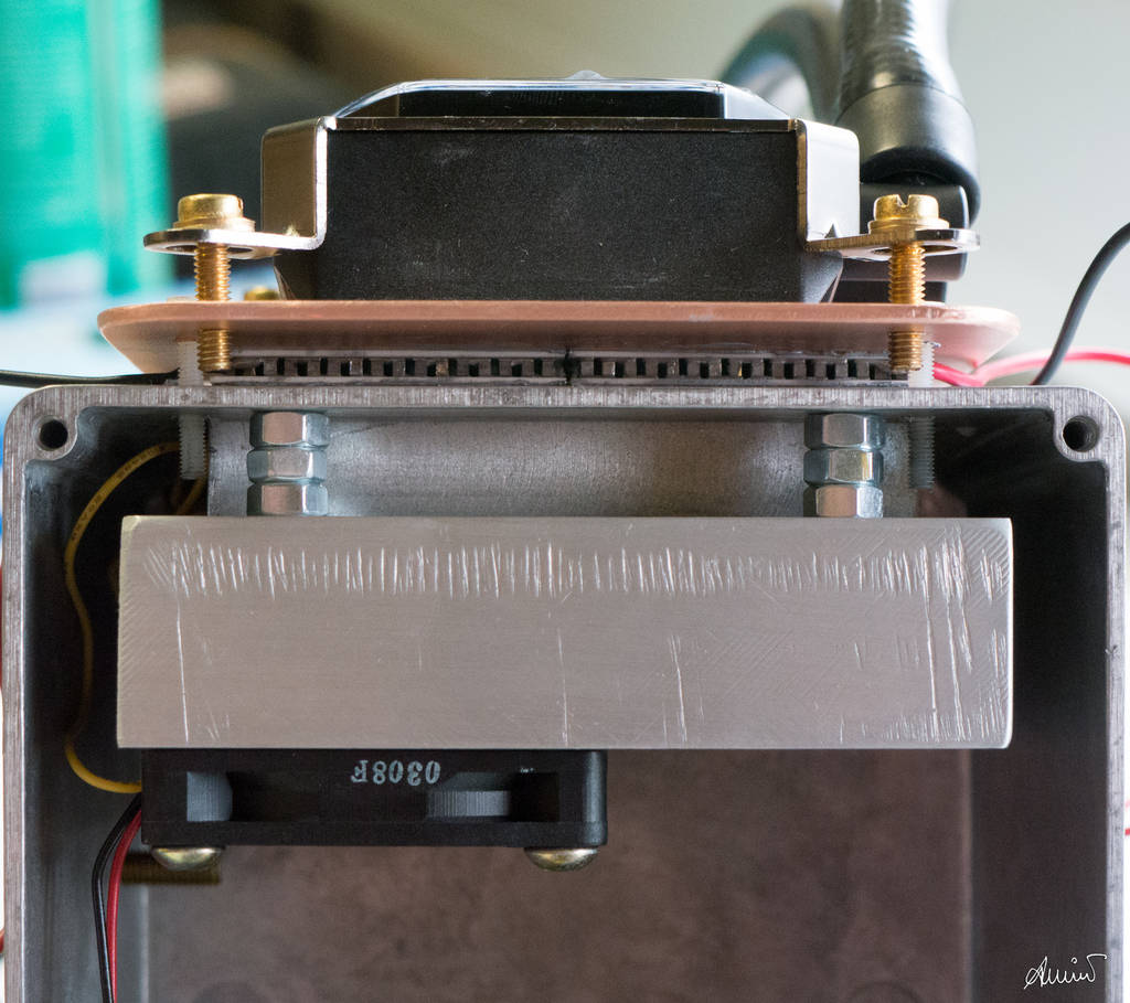 Die Kühlkörper sind direkt am Peltier-Element befestigt, d.h. der Außenlüfter ist am Gehäuse montiert, der innere Lüfter wird ebenfalls am Gehäuse angeschraubt Um die Abstände einhalten zu können (Wandstärke der Box und Dicke des Peltier-Elements) und die Anschluss Leitungen nach Außen führen zu können wurde auf der heißen Seite ein gefräster Alublock beigelegt.