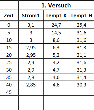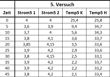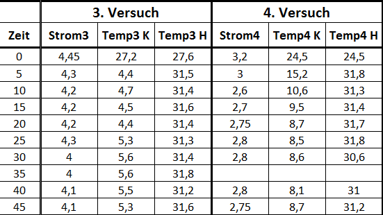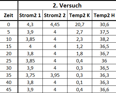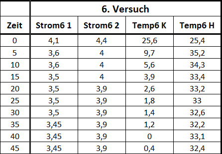 Im 4. Versuch (mit den PVC-Schrauben) war die Stromaufnahme zwar geringer, aber ebenso die Kühlleistung.