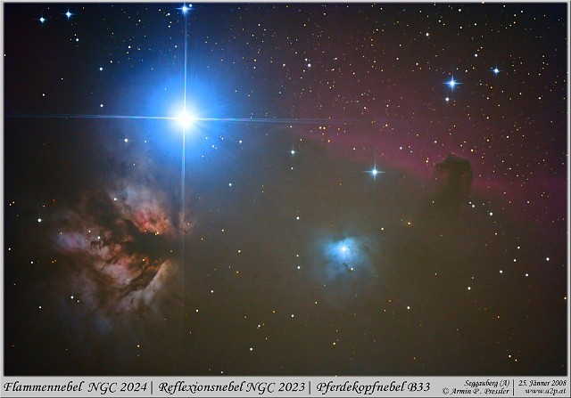 | NGC 2024 | NGC 2023 | B 33 Flammennebel Reflexionsnebel Pferdekopfnebel (25. Jänner 2008) | 27.01.08 21:43 | 1034x723px | 134kB |