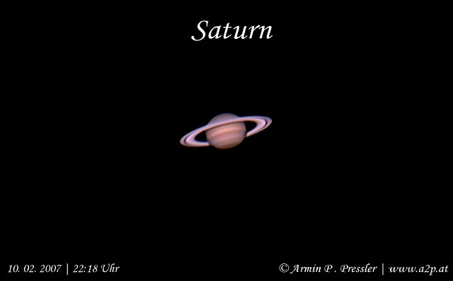 | Saturn (10. Februar 2007) 2000 Bilder mit der Webcam bei 4m Brennweite durch den Baader FFC gestackt. Baader FFC @ 4m | TouCam | 10" Newton | 16.02.07 23:25 | 800x497px | 26kB |