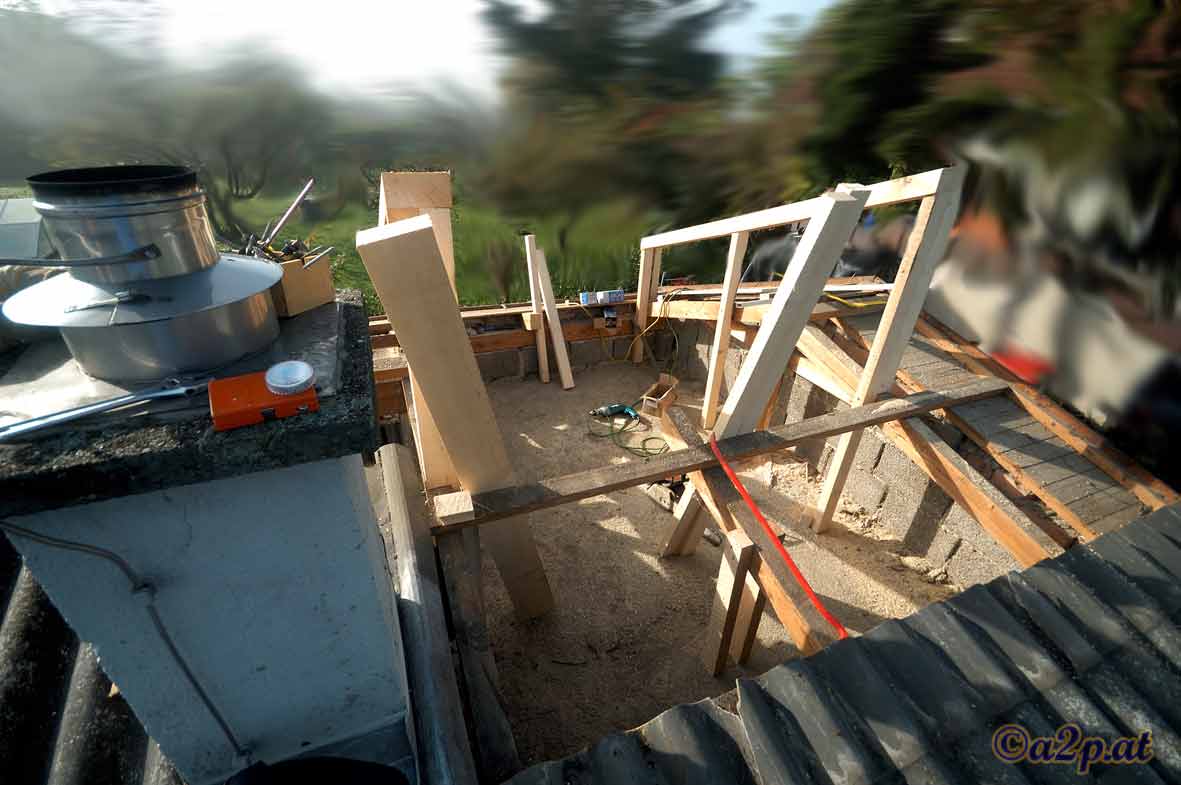 Nun ging es weiter mit der Rohkonstruktion. Der gekürzte Sparren musste zusätzlich abgestützt werden, die stehenden Hölzer für die Seitenwände wurden zugeschnitten und am Dachboden fixiert.