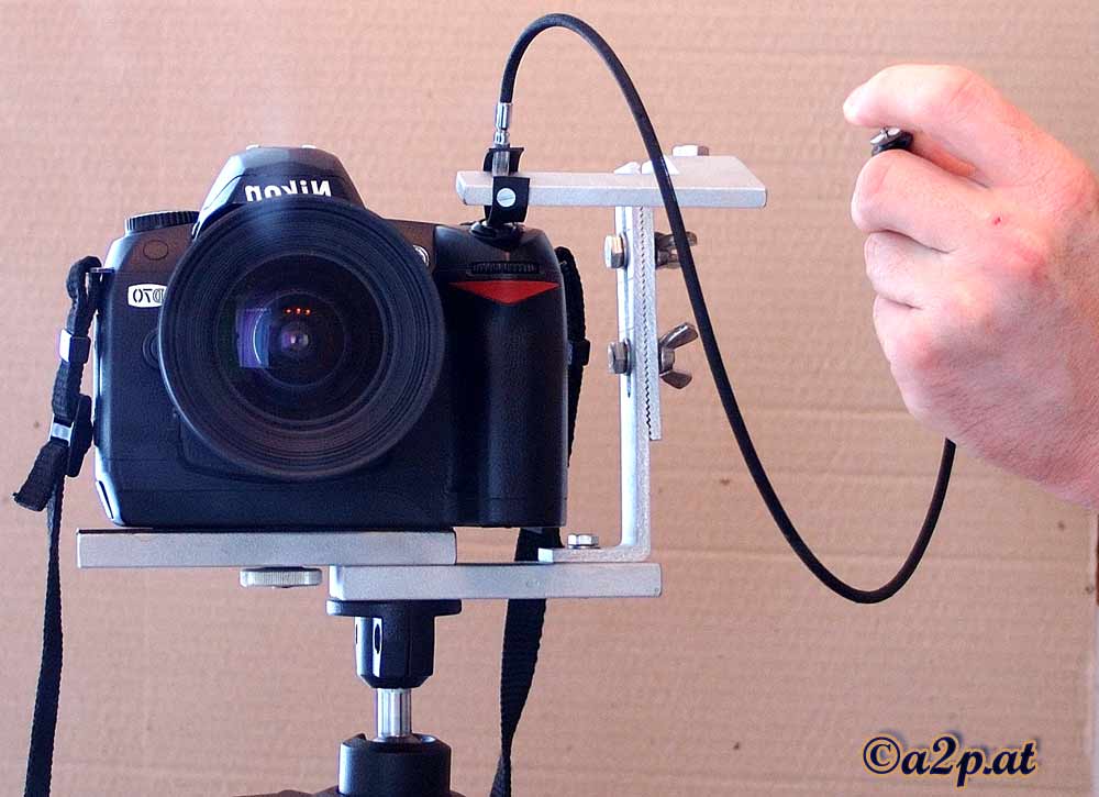 Bei der großen Ausgabe der Bilder kann man auch erkennen, dass der Dorn des Auslösers nicht direkt auf den Kunststoff-Auslöseknopf der Nikon drückt. Vielmehr drückt er durch einen Gummistreifen um wiederum Kratzer zu vermeiden.