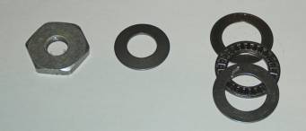 Die Reihenfolge der Lagerteile: Von links nach rechts: Drehmoment-Mutter, Spannring, Lager mit seinen beiden Deckeln.