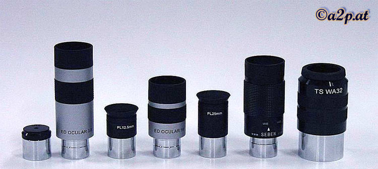 (Oktober 2005) Im Moment besitze ich neben den beiden zum LidlScope und dem Tchibotorpedo mitgelieferten Okularen vom Typ Kellner und Hygens ein paar günstige TS-Plössel (25 mm / 12,5 mm und 9 mm) und seit neuestem ein Paar Seben ED Okulare. Zum neuen 10" Celestron Newton bestellte ich mir noch das TSWA32 2" Weitwinkelokular. Für die Russentonne habe ich mir noch ein Seben 8-20mm Zoomokular zugelegt. Der optische Unterschied zwischen den Kellner/Hygens und den Plössel- bzw. ED Okularen ist enorm.