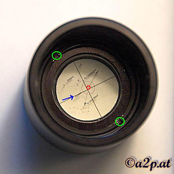 Leider musste ich feststellen, dass dieser Polsucher nicht rotationssymmetrisch ist. Das bedeutet, die Kreuzmarkierung für den wahren Himmelspol "eiert" mehr oder weniger stark um die Achse, des inneren Polkreises, wenn man den Polsucher dreht. Bei meinem Polsucher war es beinahe der Radius des Polkreises also fast 3/4°.