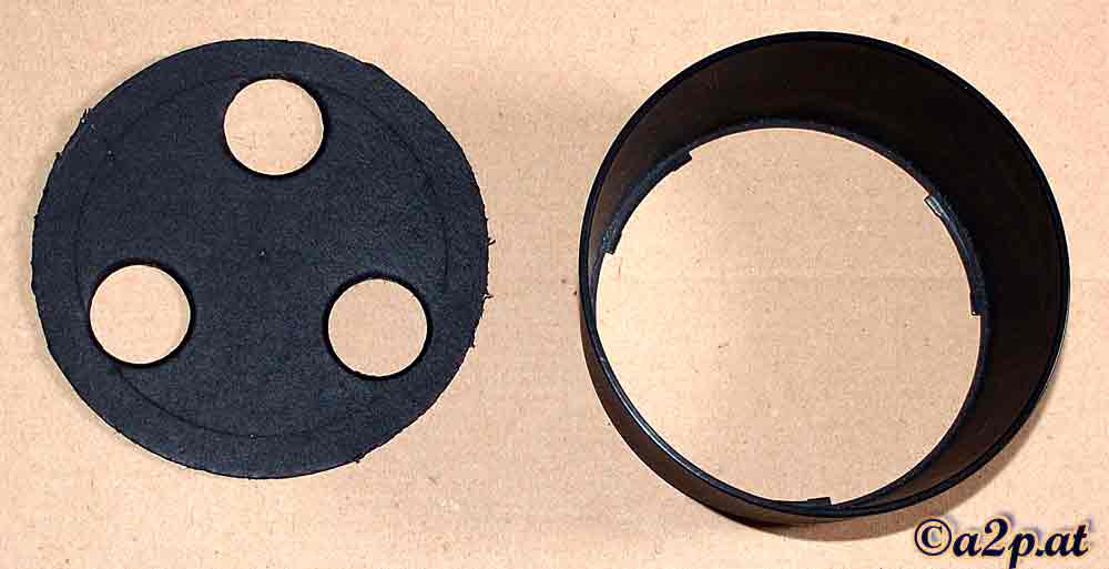 Die Blende ist aus Pappe und matt schwarz lackiert. Sie passt genau in die Gegenlichtblende des Objektivs.