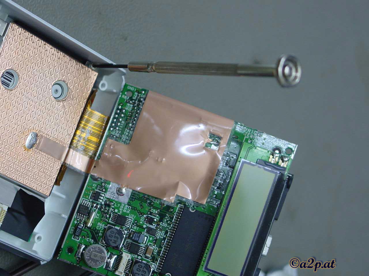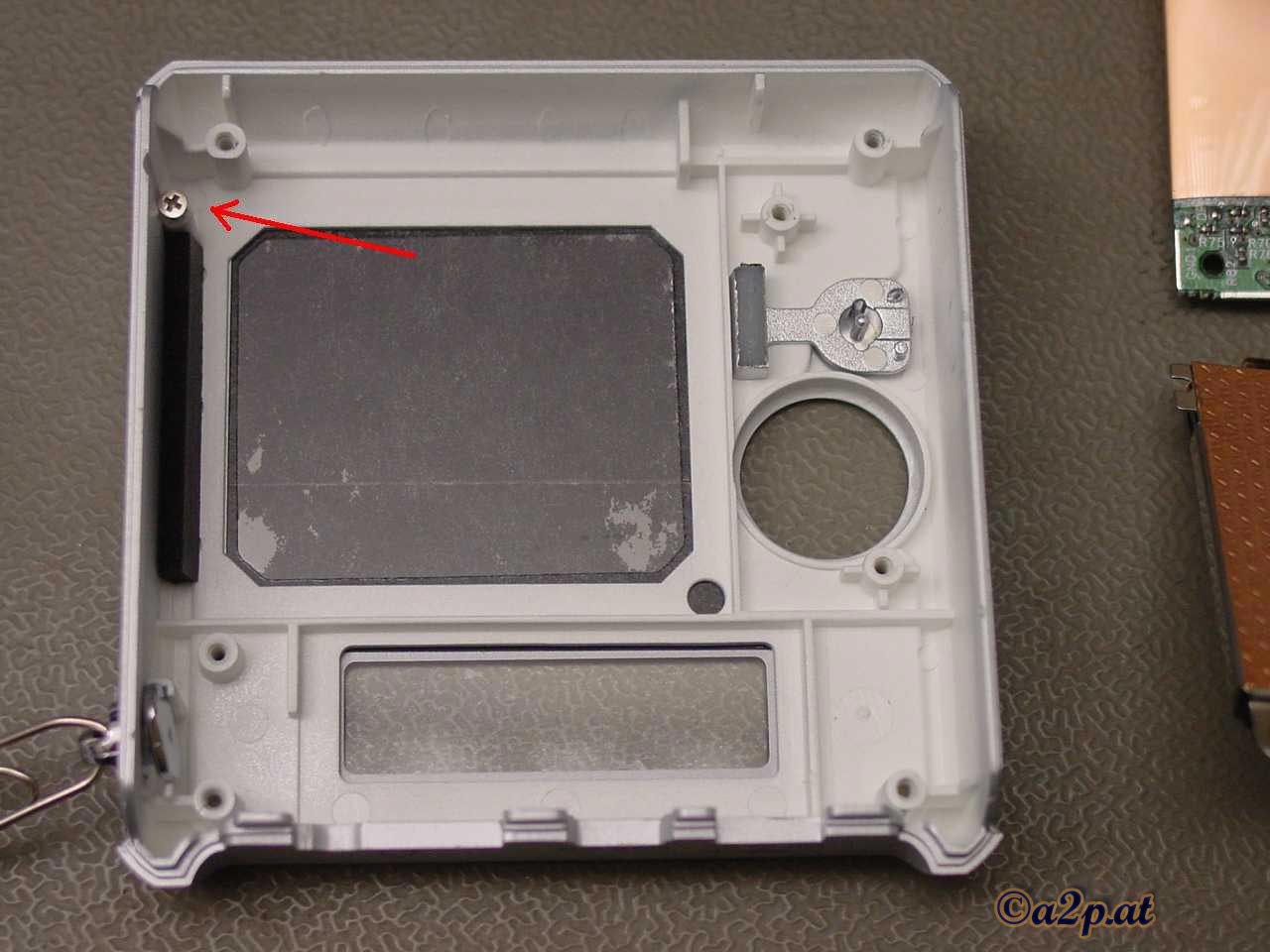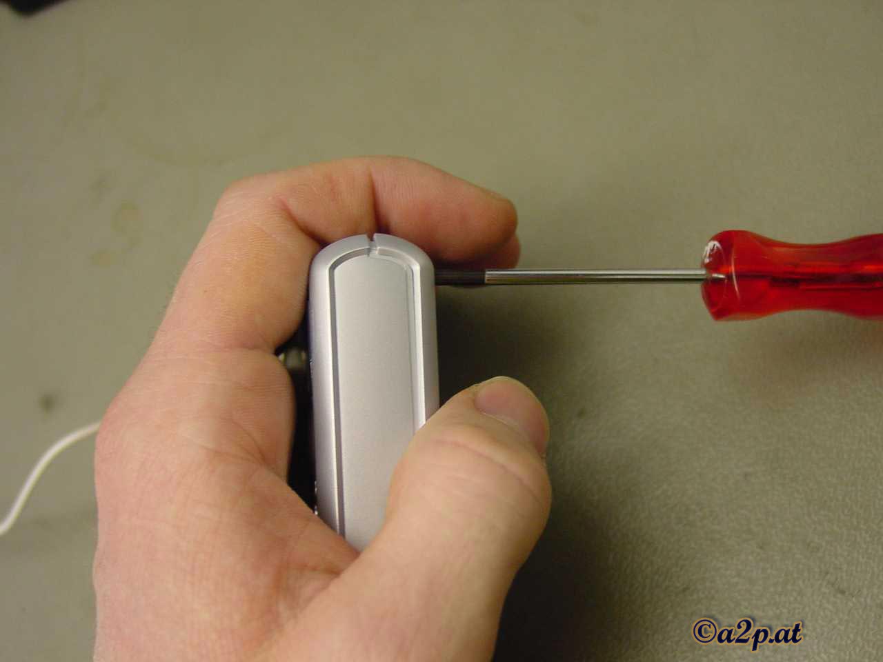 Originalgröße) Das Lösen der 4 äußeren Gehäuseschrauben ist am Schwierigsten bei der ganzen Prozedur: Diese Schrauben sitzen extrem fest, man sollte sie nur mit einem perfekt passenden Schraubendreher (bei mir Phillips Kreuzschraubendreher Gr. 0) lösen. Am besten macht man das, indem man den MuVo² in der einen Hand hält und mit der anderen die Schrauben löst, niemals das Gerät auf eine Tischplatte o.ä. legen und dann versuchen die Schrauben zu lösen -dabei kann das Kunststoff-Gehäuse beschädigt werden! |