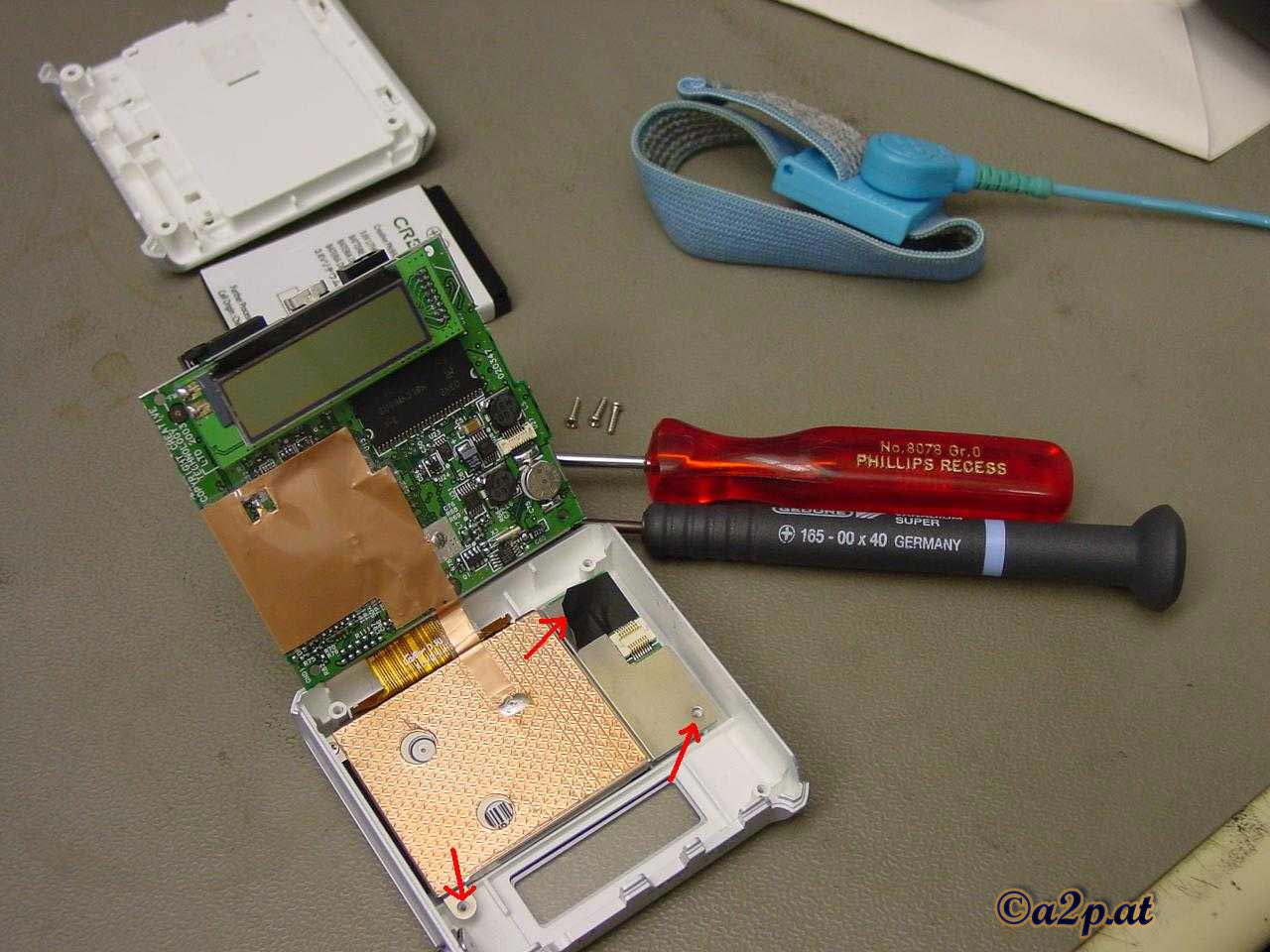 Die 3 schwarzen Schrauben werden mit dem Schraubendreher Gr. 00 vorsichtig gelöst (siehe rote Pfeile). |